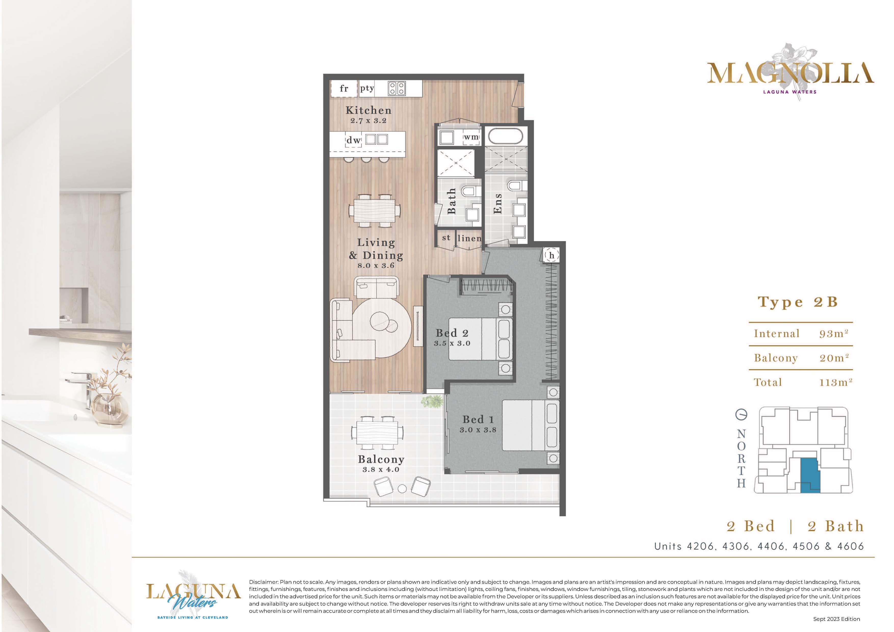 An east facing 2 bedroom, 2 bathroom, 1 car park apartment on Level 6 of Building 4 at Laguna Waters Cleveland. Features open plan living and dining, quality kitchen with pantry, ensuite to master bedroom, walk-in robe and laundry with an east-facing balcony. Total 114m².